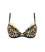 BH met zachte cups in goudgelamineerd geschulpt borduursel. De ruggen zijn van effen tule, versierd met hoge en lage kragen. Een goudkleurig juweel met dubbele ring siert de voorste bandjes. En nog een goudenkleurig juweel met een klein strasssteentje siert het decoleté .