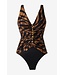 Dit badpak kleed slank af met kunstige plooien en printpatronen die je zandloperfiguur accentueren, met verleidelijke gouden details aan de voorkant.